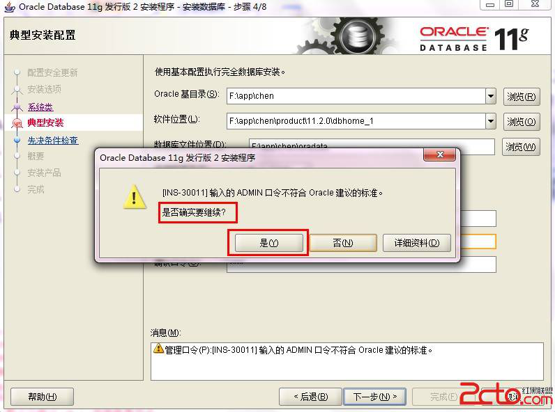 9、 典型安装。 重要步骤。建议只需要将Oracle基目录更新下,目录路径不要含有中文或其它的特殊字符。全局数据库名可以默认,且口令密码,必须要牢记。密码输入时,有提示警告,不符合Oracel建议时不用管。 (因Oracel建议的密码规则比较麻烦, 必须是大写字母加小写字母加数字,而且必须是8位以上。麻烦,可以输入平常自己习惯的短小密码即可) 如图: